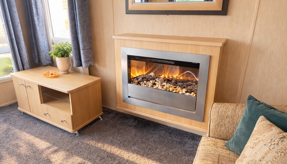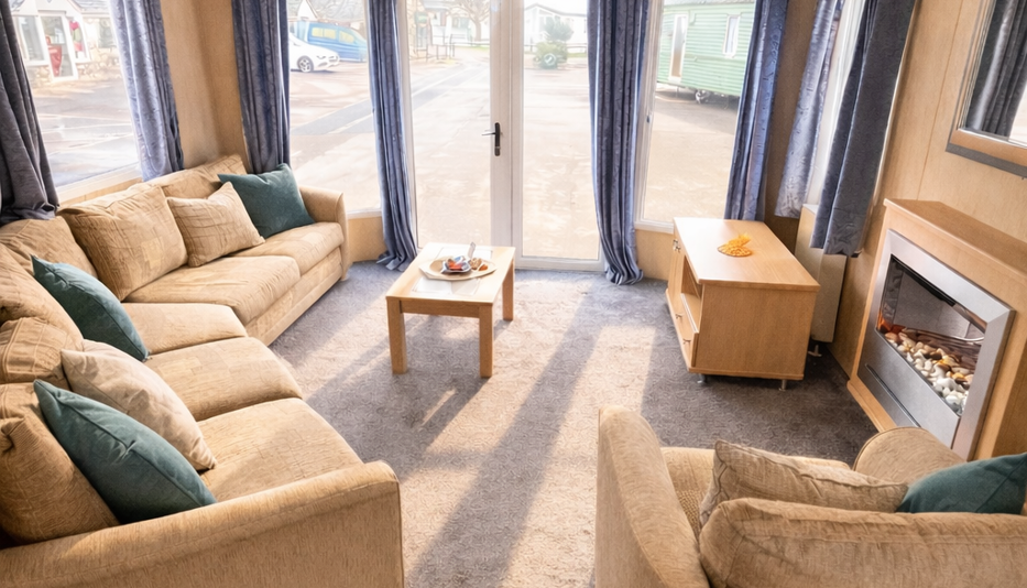 Step inside this stunning holiday home and you’ll instantly feel the warmth and space it has to offer. Designed with comfort in mind, it features a bright and airy open-plan living area with large front windows and front opening patio doors, allowing plenty of natural light to flow through and providing easy access onto the front decking area — perfect for relaxing outdoors. The cosy lounge includes comfortable seating and a stylish feature fireplace, ideal for unwinding in the evenings.