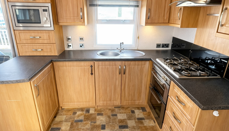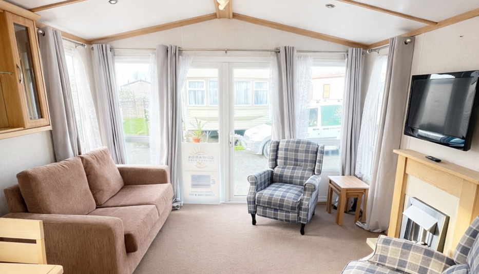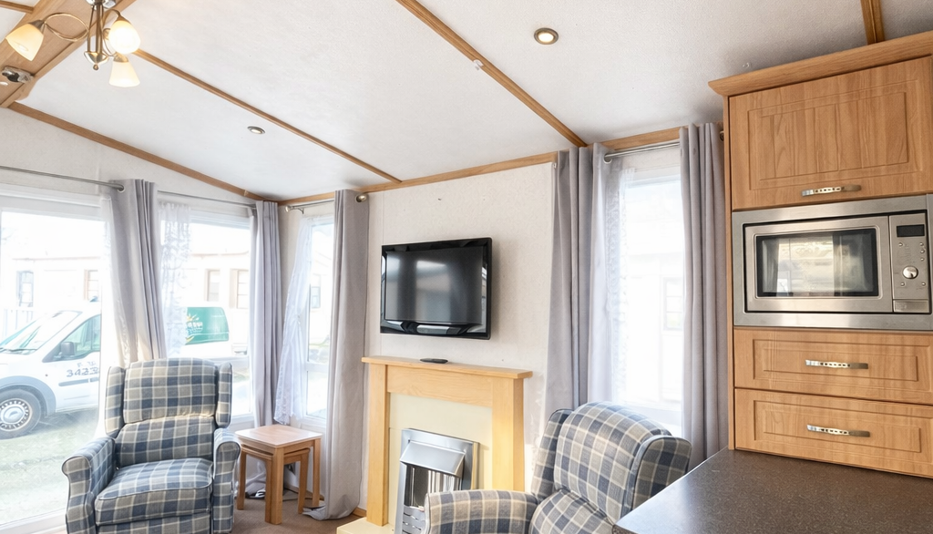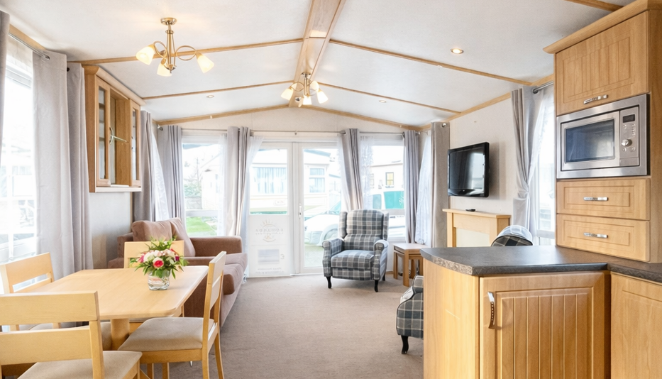 This Carnaby Rosedale (36ft x 12ft) is a beautifully presented 2-bedroom holiday home, offering a bright, welcoming interior and excellent value for anyone looking to enjoy their own getaway retreat. The spacious open-plan living area is filled with natural light thanks to the front opening doors and large windows, creating a relaxing and airy space to unwind. Comfortable seating and a modern layout make it perfect for both quiet evenings and entertaining.