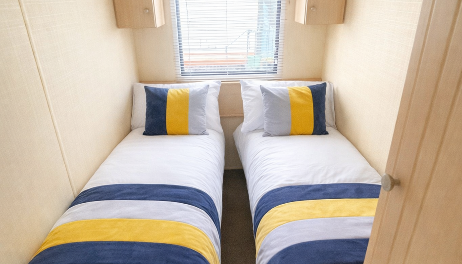 Three inviting bedrooms offer flexible sleeping arrangements, including two twin rooms finished in calming neutral tones, ensuring a restful night’s sleep. With a warm, neutral interior and practical layout throughout, this holiday home is a welcoming base for enjoying your stay.