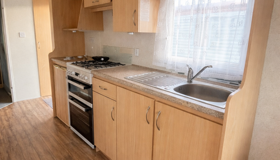 The adjoining kitchen is practical and modern, fitted with ample cupboard space, a gas cooker, oven, and sink beneath a window for a light and functional cooking area.