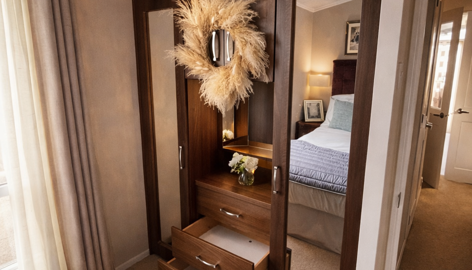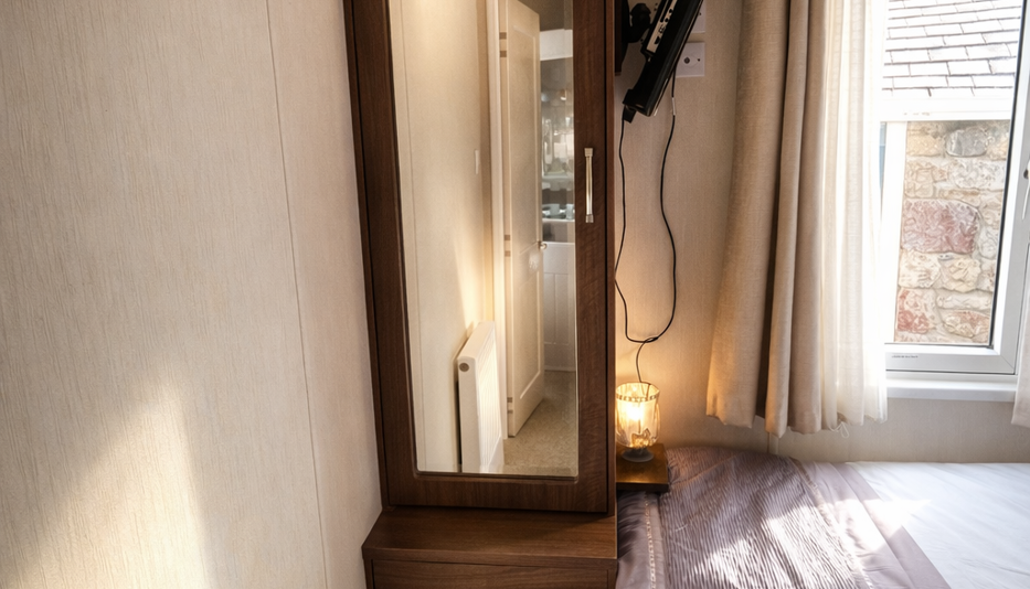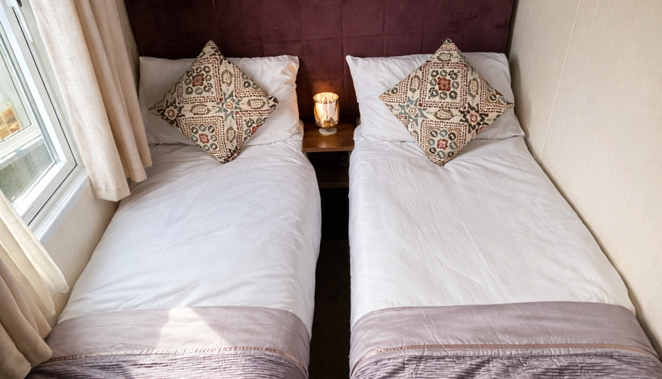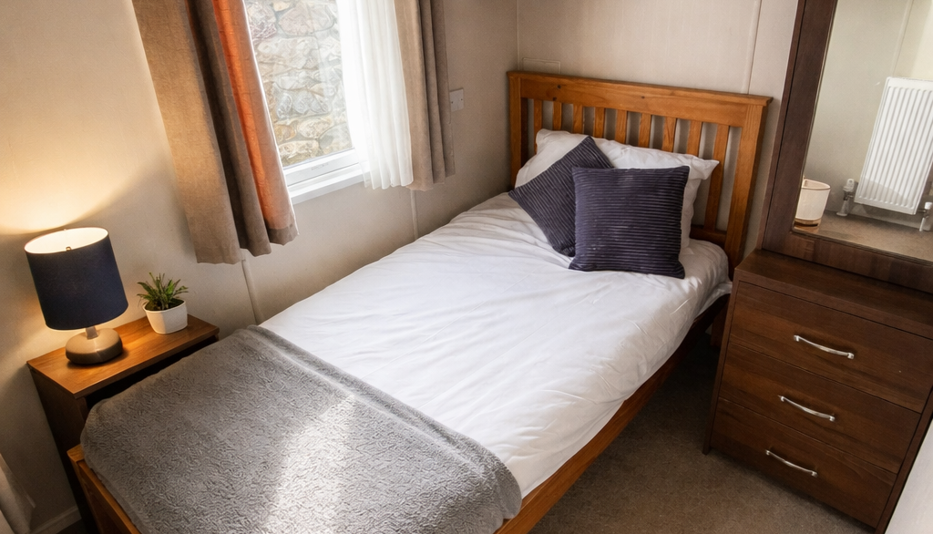 The holiday home benefits from three well-proportioned bedrooms. The master bedroom is stylish and cosy, complete with fitted furniture and an en-suite bathroom for added privacy. The twin bedrooms are thoughtfully arranged, offering comfortable sleeping space and practical storage, making them ideal for guests or children.