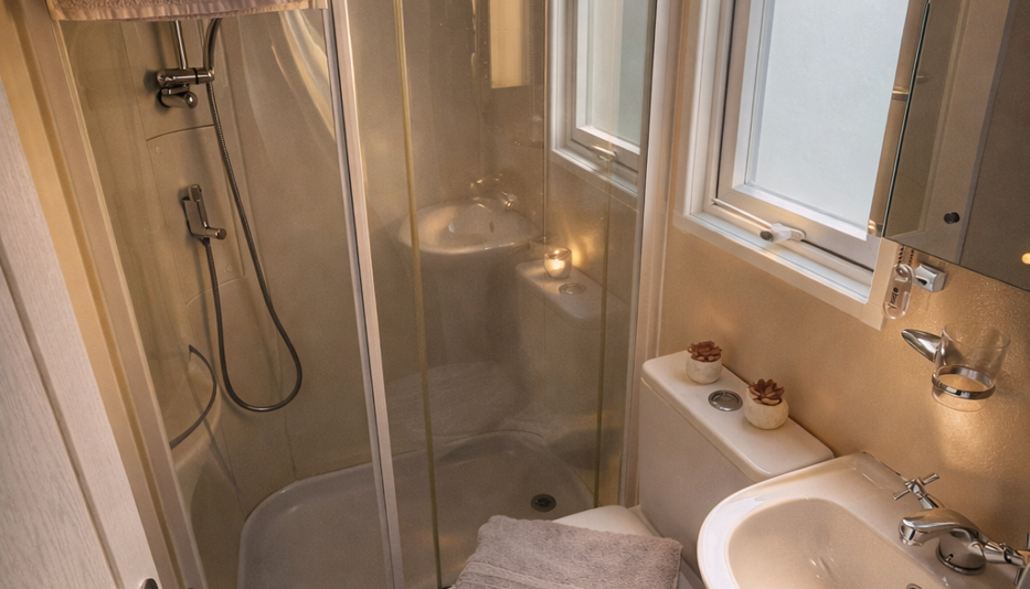 The main bathroom is modern and fresh, featuring a shower enclosure, WC, and wash basin, finished in neutral tones for a clean, contemporary feel.